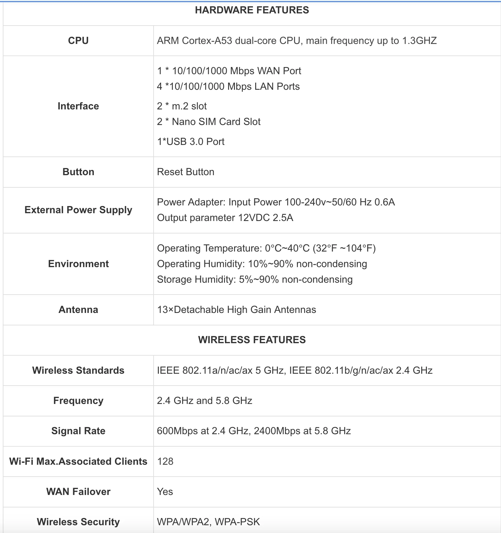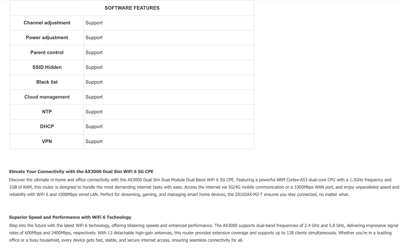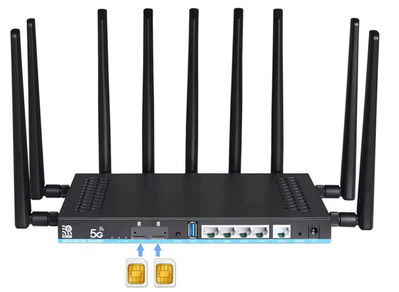 Sini 5G-8102ax 5G/4G+WIFI6 reititin jossa rautatason kiihdytin 5G ja Wifi toimintoihin, palomuuri. Mediatek MTK7981B piirisarja , jossa Openwrt käyttöjärjestelmä 21.02 (tuetut kielet, Sverige, suomi, English) ,1 x WAN 1Gb) , 4 LAN porttia (1Gb).5G modeemi Qualcomm sdx62 4G, 5G NSA ja SA tuki